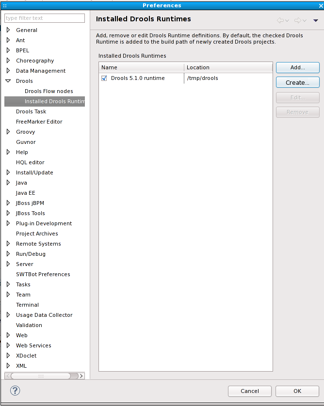 Current Installed Drools Runtime Preferences page is little bit confusing (Menu > Window > Preferences > Drools > Installed Drools Runtimes). When user choose button Add... it opens dialog where user can specify Name and Location of existing Drools Runtime or choose button "Create New Drools 5 Runtime" which will open native dialog for selecting directory where to create new Drools Runtime and populate correctly Name and Location text field. This is little bit non standard behavior and user doesn't know what exactly happened.