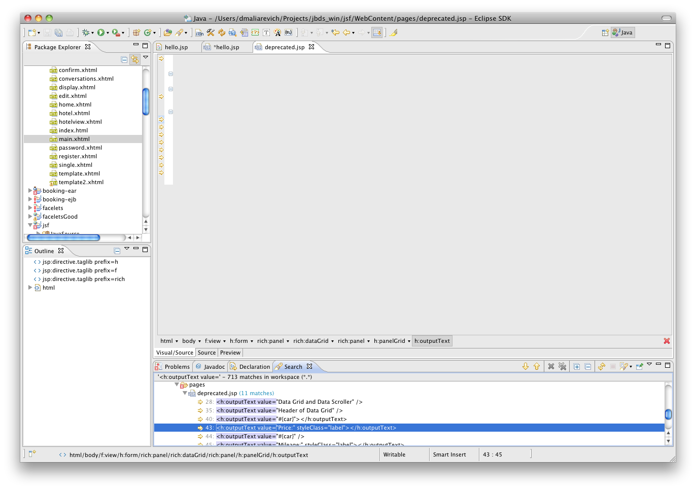 When having a match in the Searches view that matches a xhtml file then more often than not the UI for the visual page editor and sometimes the whole editor is just grey as if nothing is rendering.