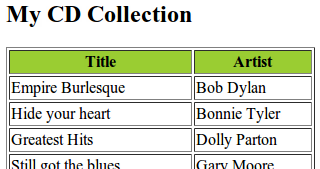 <?xml version="1.0" encoding="ISO-8859-1"?> <!-- Edited by XMLSpy® --> <xsl:stylesheet version="1.0" xmlns:xsl="http://www.w3.org/1999/XSL/Transform"> <xsl:template match="/"> <html> <body> <h2>My CD Collection</h2> <table border="1"> <tr bgcolor="#9acd32"> <th>Title</th> <th>Artist</th> </tr> <xsl:for-each select="catalog/cd"> <tr> <td><xsl:value-of select="title"/></td> <td><xsl:value-of select="artist"/></td> </tr> </xsl:for-each> </table> </body> </html> </xsl:template> </xsl:stylesheet>