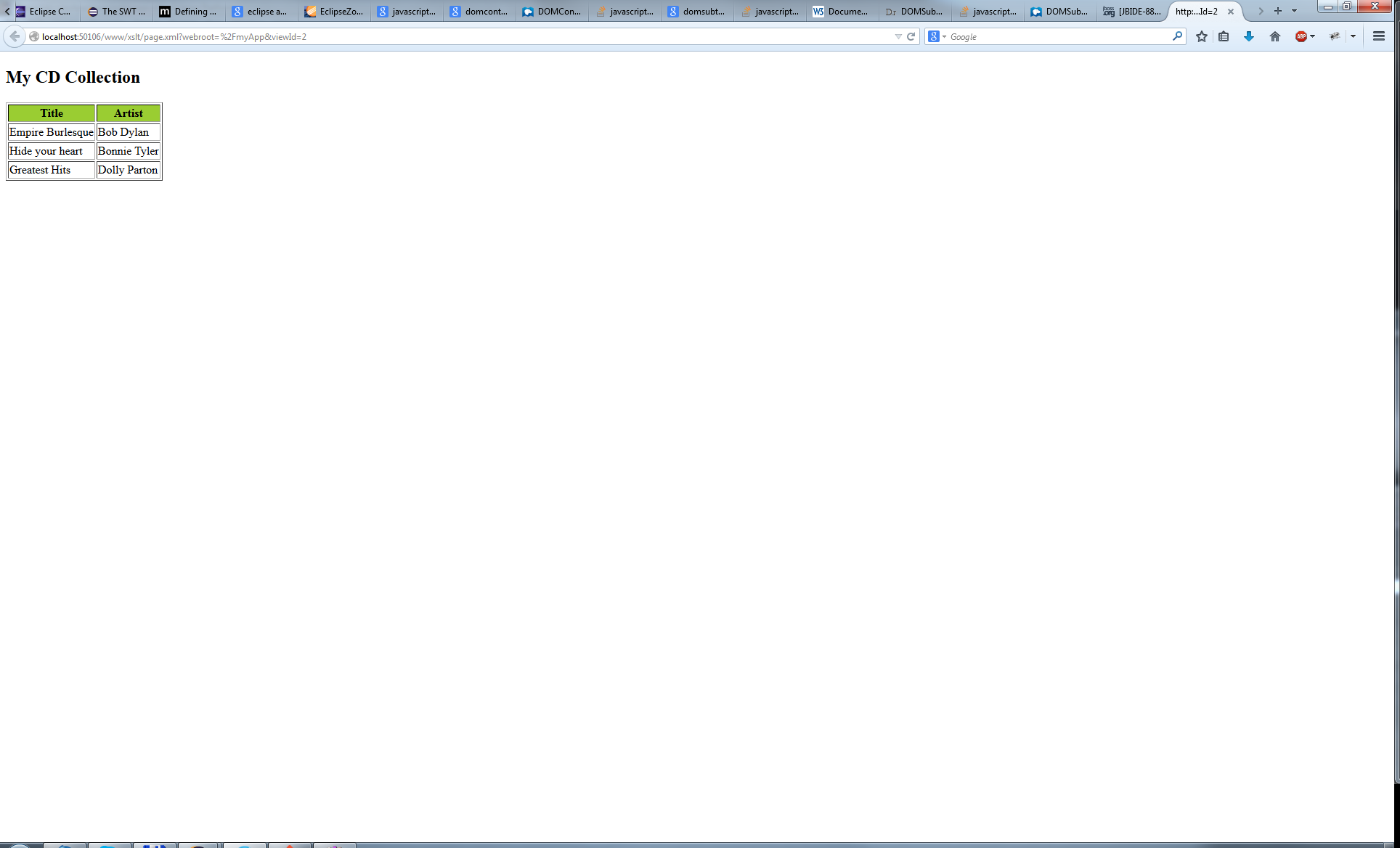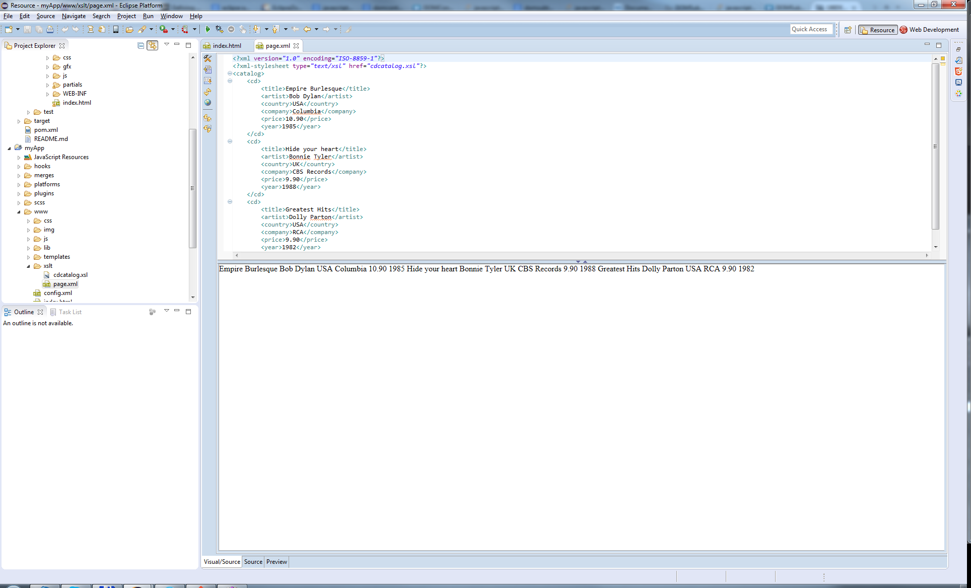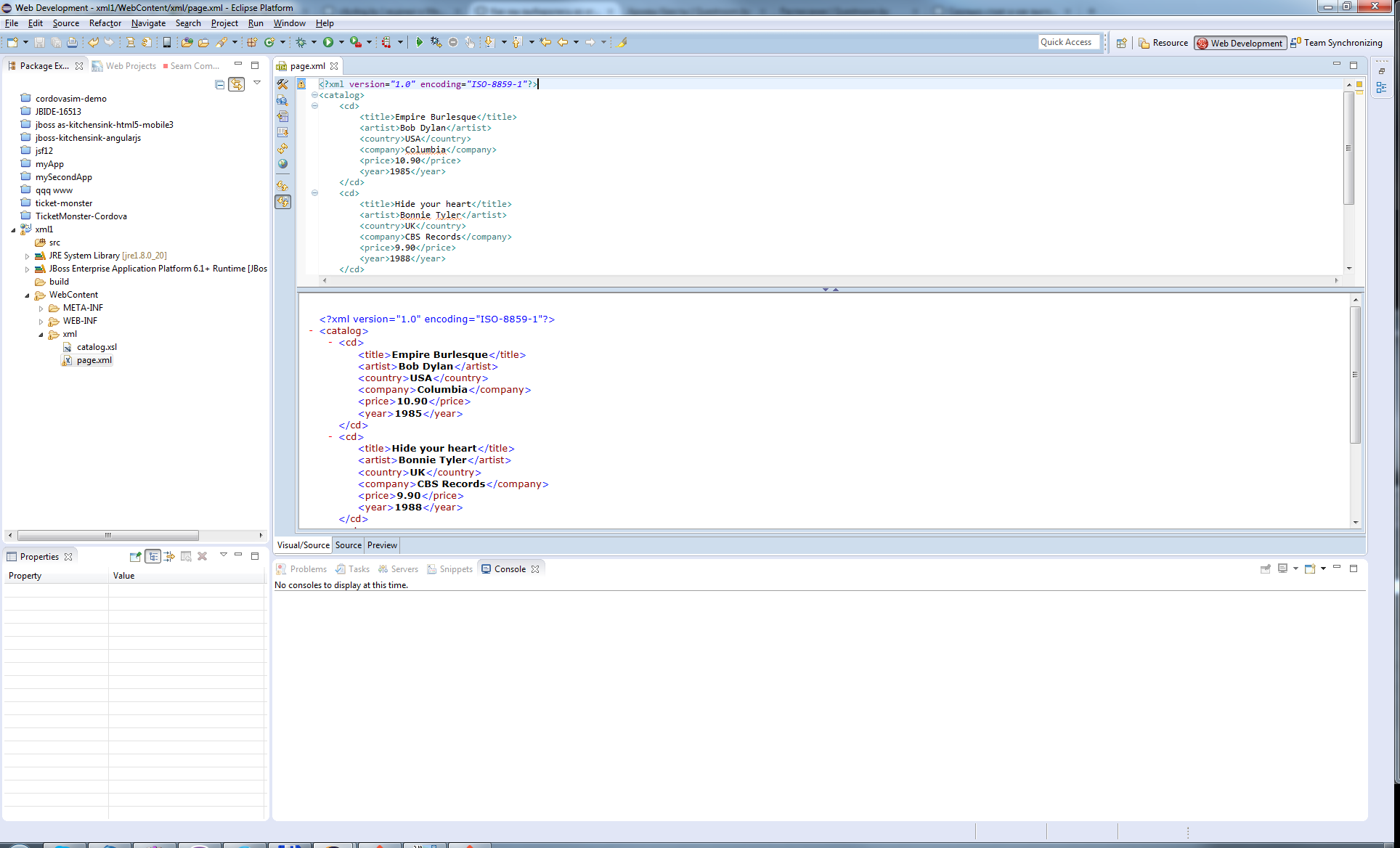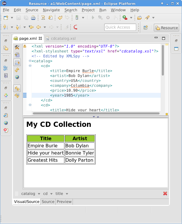 <?xml version="1.0" encoding="ISO-8859-1"?> <?xml-stylesheet type="text/xsl" href="cdcatalog.xsl"?> <!-- Edited by XMLSpy® --> <catalog> <cd> <title>Empire Burlesque</title> <artist>Bob Dylan</artist> <country>USA</country> <company>Columbia</company> <price>10.90</price> <year>1985</year> </cd> <cd> <title>Hide your heart</title> <artist>Bonnie Tyler</artist> <country>UK</country> <company>CBS Records</company> <price>9.90</price> <year>1988</year> </cd> <cd> <title>Greatest Hits</title> <artist>Dolly Parton</artist> <country>USA</country> <company>RCA</company> <price>9.90</price> <year>1982</year> </cd> </catalog>