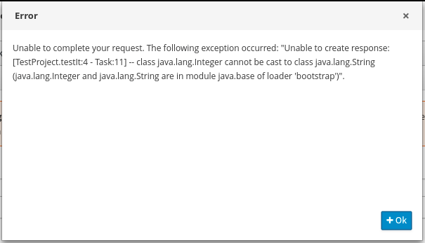 11:47:52,197 ERROR [org.kie.server.remote.rest.jbpm.ProcessResource] (default task-13) Unexpected error during processing [TestProject.testIt:4 - Task:11] -- class java.lang.Integer cannot be cast to class java.lang.String (java.lang.Integer and java.lang.String are in module java.base of loader 'bootstrap'): org.jbpm.workflow.instance.WorkflowRuntimeException: [TestProject.testIt:4 - Task:11] -- class java.lang.Integer cannot be cast to class java.lang.String (java.lang.Integer and java.lang.String are in module java.base of loader 'bootstrap')