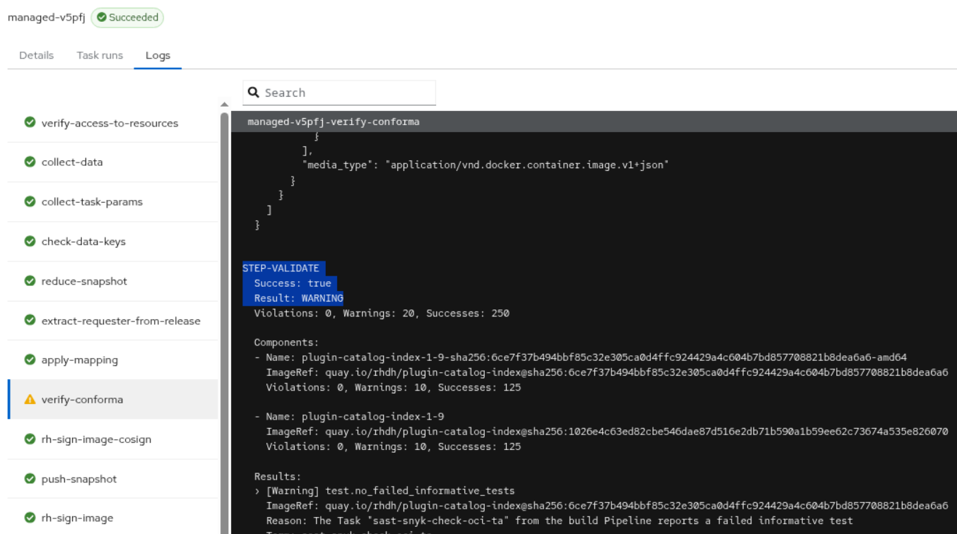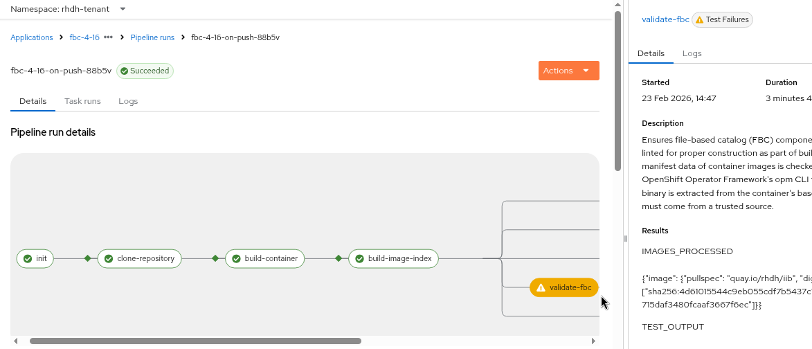 But for an FBC, which is ONLY meaningful if it's able to be merged into the overall OperatorHub index, WHY would anyone ever want to see a "passing" build with validate-fbc task failures being hidden as a "warning" ? This just hides a problem until GA day when you're surprised that all your green builds are actually not releaseable.