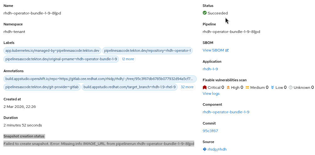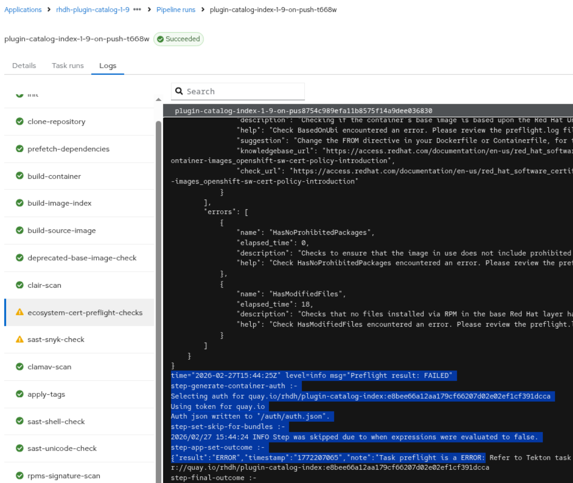 Failed required ecosystem or FBC validation checks, but build shows "Succeeded"; also warning icon sometimes means failed with error, sometimes warnings
