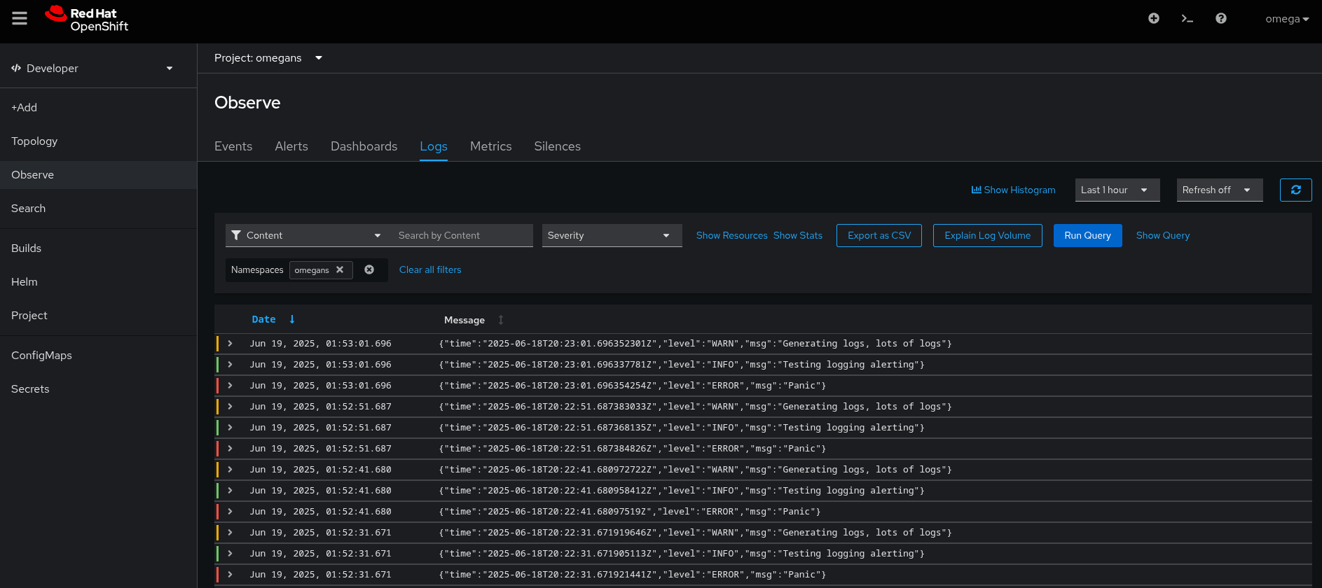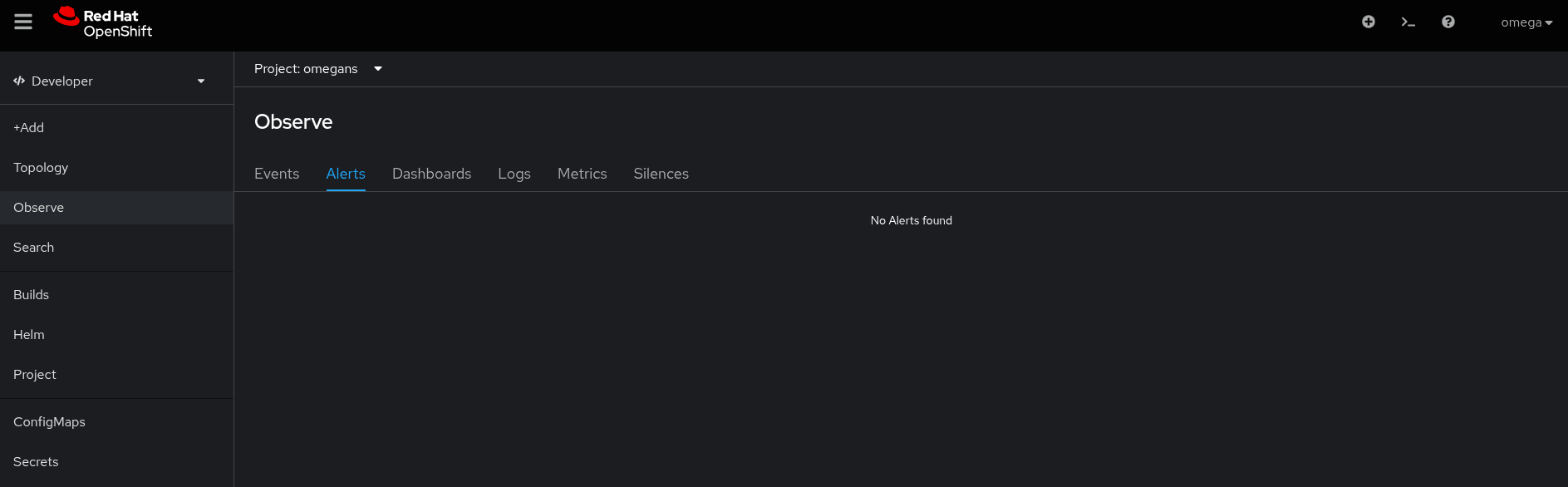 - `omega` user should be able to see their own namespace alerts in the Observe> Alerts section under the Developer web console.