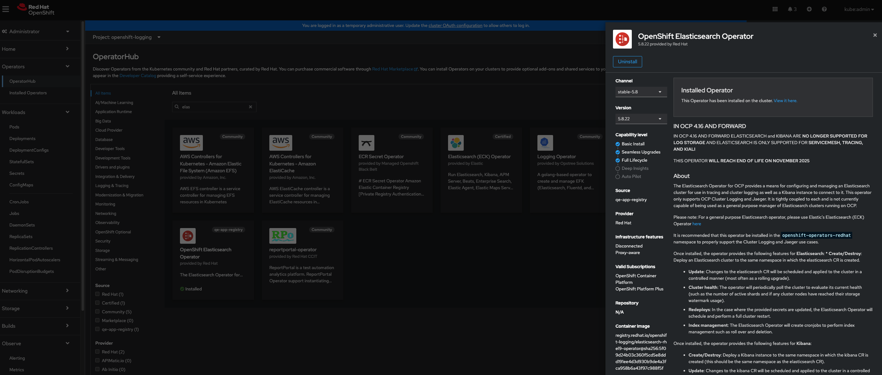> ELASTICSEARCH IS ONLY SUPPORTED FOR SERVICEMESH, TRACING, AND KIALI, AND THIS OPERATOR WILL BE REMOVED FROM THE OPENSHIFT OPERATOR CATALOG IN NOVEMBER 2025. ELASTICSEARCH IS NO LONGER SUPPORTED FOR LOG STORAGE. KIBANA IS NO LONGER SUPPORTED IN OCP 4.16 AND FORWARD.