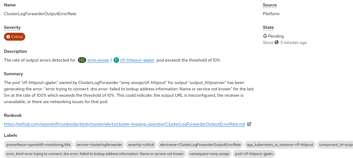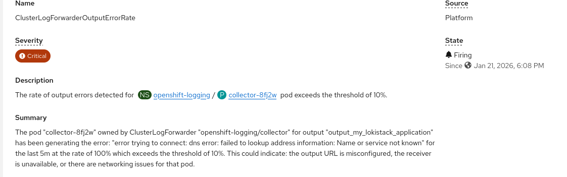 - Verify the alert identifies the CLF namespace, name, collector pod name, and error.