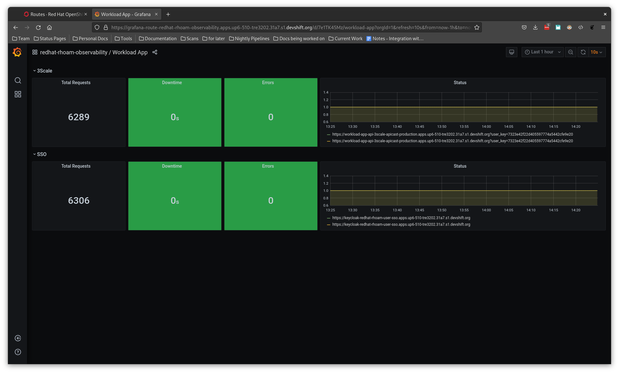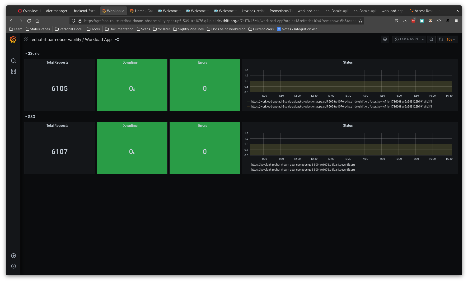 Note: it's normal that graph will show a short downtime at the start for 3scale because the workload-web-app is usually deployed before the 3scale API is ready, see MGDAPI-1266