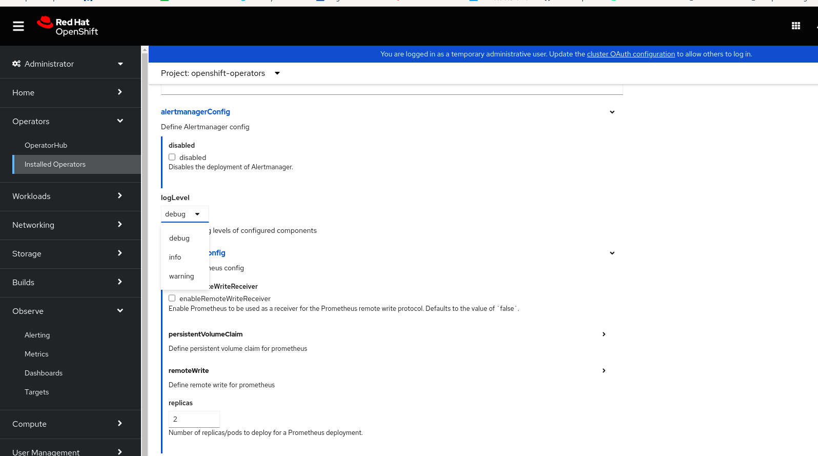 2022-10-14T06:39:09Z    ERROR    Reconciler error    {"controller": "monitoringstack", "controllerGroup": "monitoring.rhobs", "controllerKind": "MonitoringStack", "monitoringStack": {"name":"sample-monitoring-stack","namespace":"openshift-operators"}, "namespace": "openshift-operators", "name": "sample-monitoring-stack", "reconcileID": "fbc8897a-d5e6-40ab-bb15-2dd2ab659e32", "error": "openshift-operators/sample-monitoring-stack (monitoring.rhobs/v1, Kind=Prometheus): updater failed to patch: Prometheus.monitoring.rhobs \"sample-monitoring-stack\" is invalid: spec.logLevel: Unsupported value: \"warning\": supported values: \"\", \"debug\", \"info\", \"warn\", \"error\""}