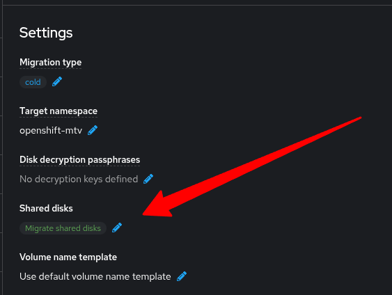 - Allow the user to pick the volumes that should be migrated (all by default) and that should be ignored. This would allow us to instruct MTV to migrate the shared volume only once which would greatly speed up the migration. We would re-attach the shared volume to other VMs manually after the migration is complete.