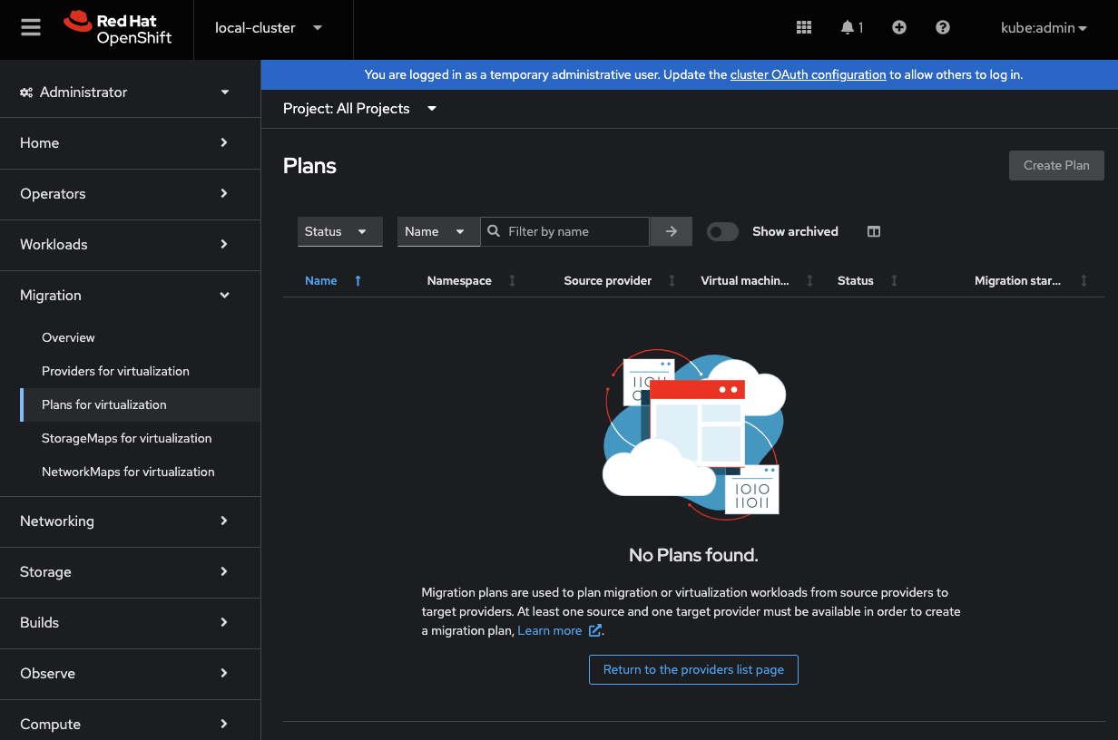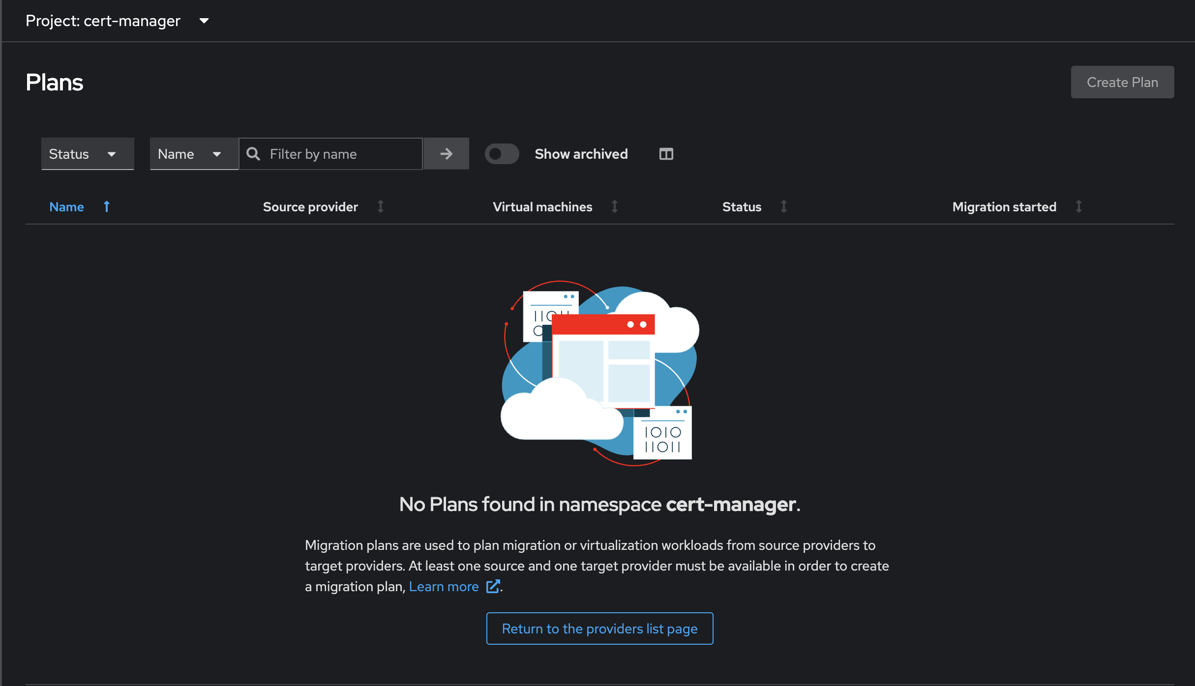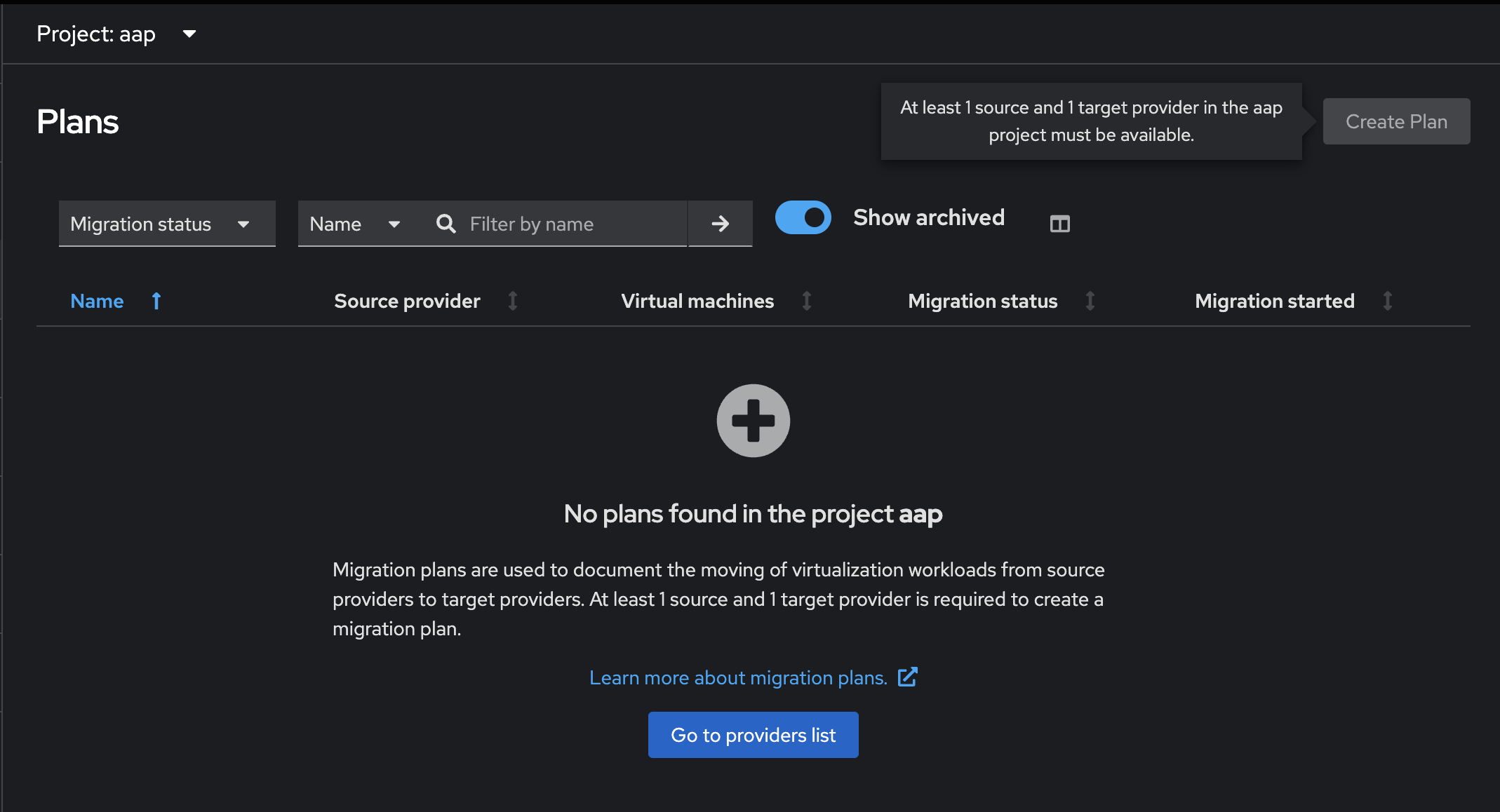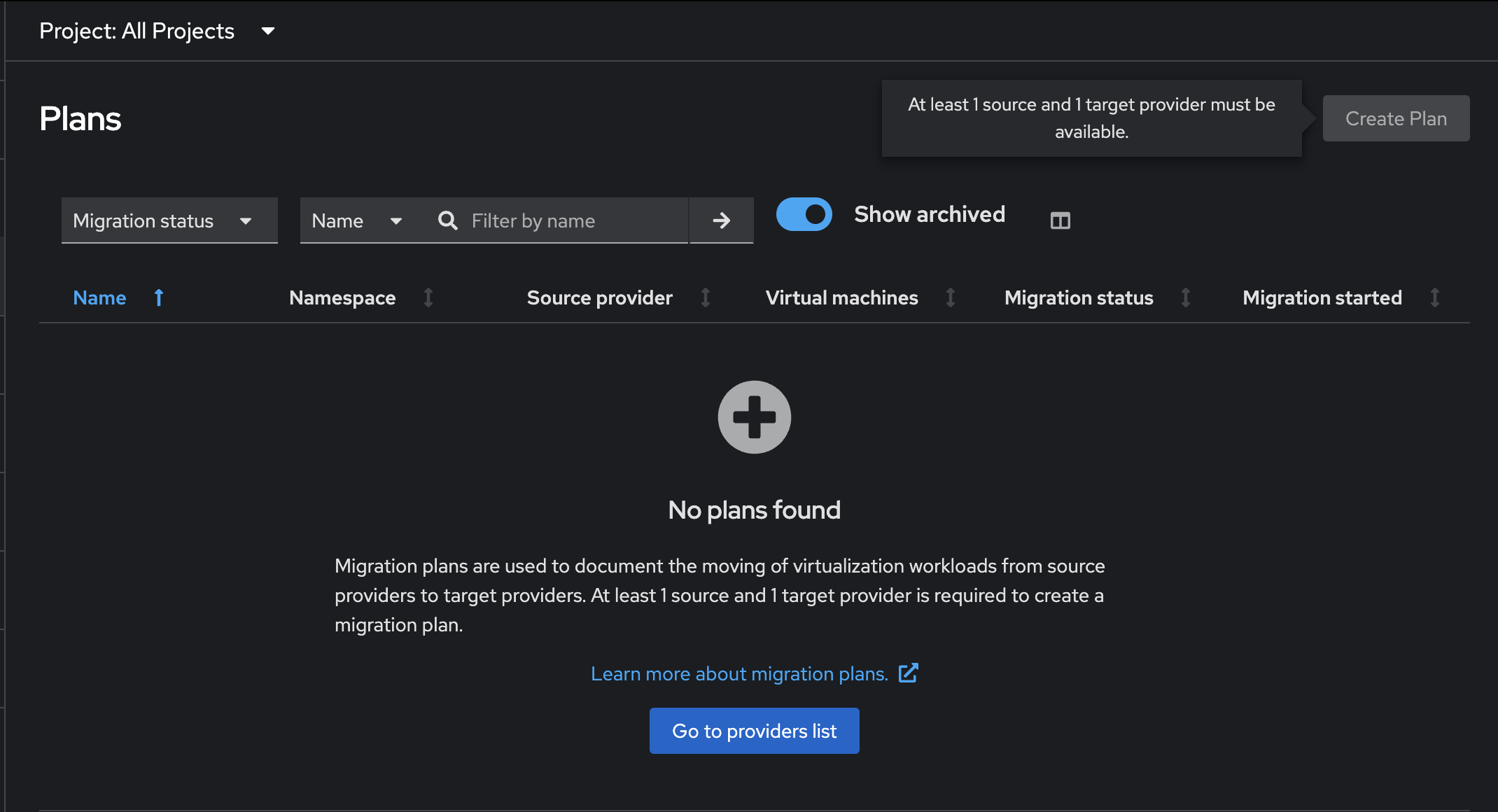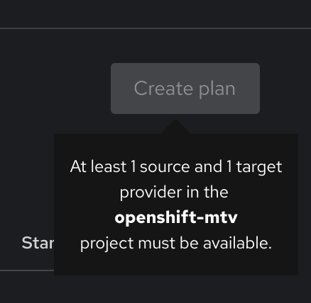 A tooltip should explain that at least 1 source and 1 target provider in the selected namespace/project are required.