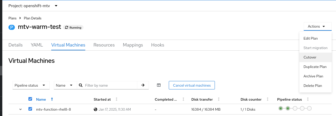4) Set the cutover in webpage: Plans -> Plan Details: Virtual Machines page select the VM and click Acitions: Cutover