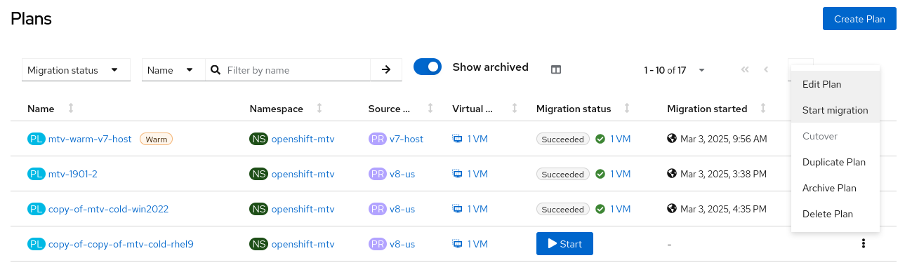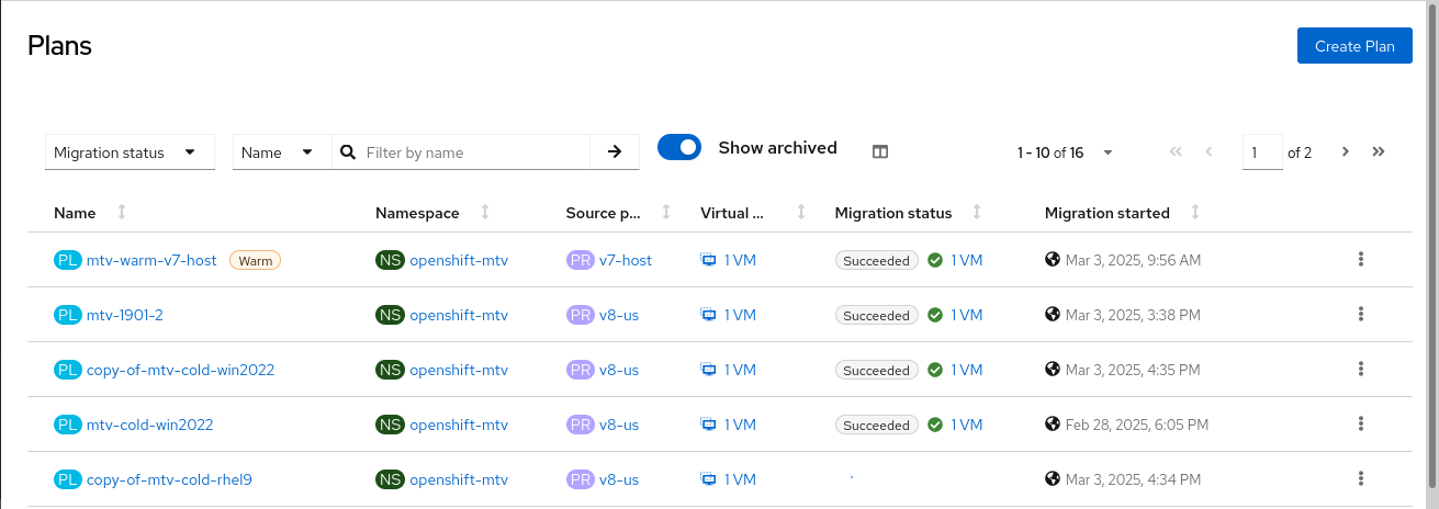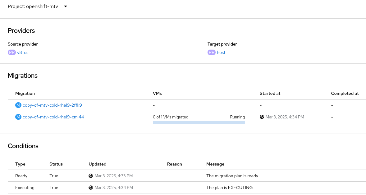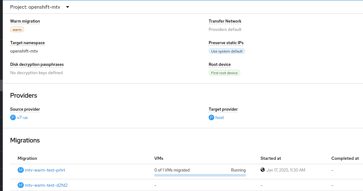 mtv-warm-test-prlvt is running, mtv-warm-test-d2fd2 is ready status