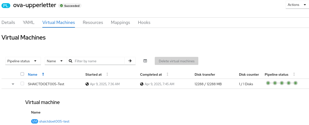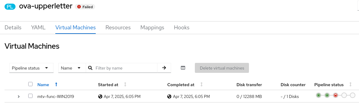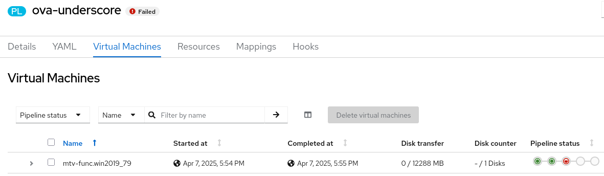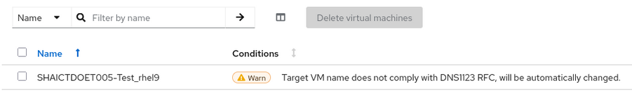 exec: /usr/bin/virt-v2v -v -x -o kubevirt -os /var/tmp/v2v -i ova /ova 2virt-v2v monitoring: Setting up prometheus endpoint :2112/metrics 3virt-v2v monitoring: Prometheus progress counter registered. 4info: virt-v2v: virt-v2v 2.5.6rhel=9,release=7.el9_5 (x86_64) 5info: libvirt version: 10.5.0 6check_host_free_space: large_tmpdir=/var/tmp free_space=434422837248 7[ 0.0] Setting up the source: -i ova /ova 8ova: orig_ova = /ova, top_dir = /ova, ova_type = Directory 9ova: processing manifest file /ova/esx8.0-win2022-x86_64-efi.mf 10sha256sum '/ova/esx8.0-win2022-x86_64-efi-2.nvram' 11sha256sum '/ova/esx8.0-win2022-x86_64-efi-1.vmdk' 12sha256sum '/ova/esx8.0-win2022-x86_64-efi.ovf' 13running qemu-nbd: 14 'qemu-nbd' '-t' '--shared=0' '--discard=unmap' '--pid-file' '/tmp/v2vqemunbd.kfoekn/qemunbd1.pid' '--socket' '/tmp/v2v.Ak0kDo/in0' '-s' '/ova/esx8.0-win2022-x86_64-efi-1.vmdk' 15virt-v2v: error: -o kubevirt: the guest name must contain only lowercase alphanumeric characters, '-' or '.', and must start and end with an alphanumeric character. Rerun virt-v2v with the '-on name' option to rename it. 16rm -rf -- '/tmp/v2vqemunbd.kfoekn' 17Unix.Unix_error(Unix.ENOENT, "unlink", "/tmp/v2v.Ak0kDo/in0") 18rm -rf -- '/tmp/v2v.Ak0kDo' 19Error executing v2v command: exit status 1 20Failed to execute virt-v2v command: exit status 1