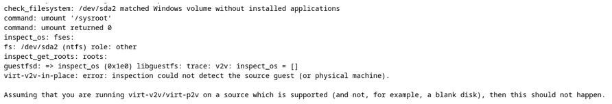 error: "virt-v2v-in-place: error: inspection could not detect the source guest (or phsical machine). Assuming that you are running virt-v2v/virt-p2v on a source which is supported(and not, for example a blank disk), then this should not happen"