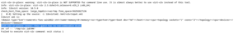 4) Create remote cold migration plan: mtv-shared-st4-remote-false, the plan failed with "virt-v2v-in-place: error: this guest has no non-removable disks", more details in attached file: mtv-shared-st4-remote-false-vm-125-hnxtf-virt-v2v.log