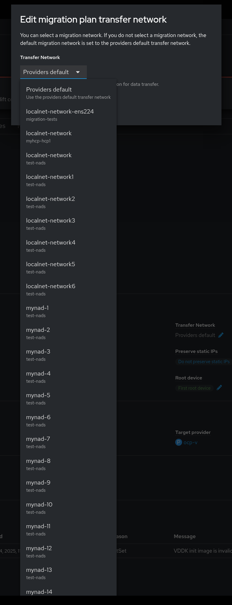 1. create too many NADs 2. create a migration plan 3. Go to Migration-> Plans for virtualization -> "select the created migration plan" -> Transfer Network