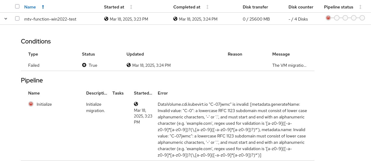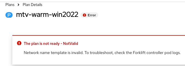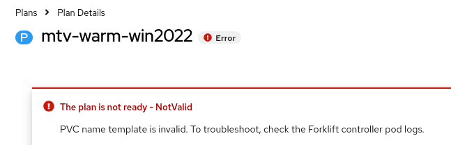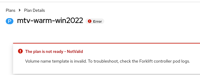 1. Create cold migration plan with pvcNameTemplate: {{if eq .DiskIndex .RootDiskIndex}}C{{else if eq .DiskIndex 1}}E{{else if eq .DiskIndex 2}}F{{else if eq .DiskIndex 3}}G{{else}}data{{end}}-{{.DiskIndex}} Plan failed in Initialization phase, as it doesn't following the DV name rule ----------------------------------------------------- DataVolume.cdi.kubevirt.io "C-07jwmc" is invalid: [metadata.generateName: Invalid value: "C-0": a lowercase RFC 1123 subdomain must consist of lower case alphanumeric characters, '-' or '.', and must start and end with an alphanumeric character (e.g. 'example.com', regex used for validation is '[a-z0-9]([-a-z0-9]*[a-z0-9])?(\.[a-z0-9]([-a-z0-9]*[a-z0-9])?)*') 2. Create warm migration plan with networkNameTemplate with dot {{if eq .NetworkType "pod"}}pod{{else}}multus-{{.NetworkNamespace}}.{{.NetworkName}}_{{.NetworkIndex}}{{end}} Plan failed in VirtualMachineCreation phase, as it doesn't follow the interface name rule ----------------------------------------------------- admission webhook "virtualmachine-validator.kubevirt.io" denied the request: Network interface name can only contain alphabetical characters, numbers, dashes (-) or underscores (_), Network interface name can only contain alphabetical characters, numbers, dashes (-) or underscores (_), must not contain dots, must not contain dots, must not contain dots, must not contain dots 3. Create warm migration plan with volumeNameTemplate with dot '.'/underscores '_', plan failed in VirtualMachineCreation phase {{.PVCName}}.{{.VolumeIndex}} or {{.PVCName}}_{{.VolumeIndex}} ----------------------------------------------------------------- admission webhook "virtualmachine-validator.kubevirt.io" denied the request: must not contain dots, must not contain dots, must not contain dots, must not contain dots ----------------------------------------------------------------- admission webhook "virtualmachine-validator.kubevirt.io" denied the request: a lowercase RFC 1123 label must consist of lower case alphanumeric characters or '-', and must start and end with an alphanumeric character (e.g. 'my-name', or '123-abc', regex used for validation is '[a-z0-9]([-a-z0-9]*[a-z0-9])?')