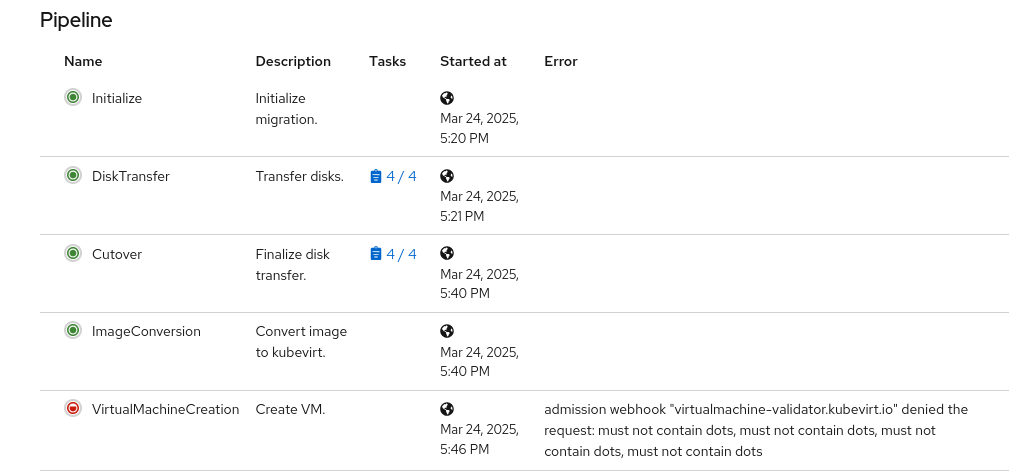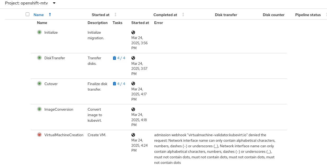 4. Start the migration plan, VirtualMachineCreation phase failed as it doesn't follow the interface name rule
