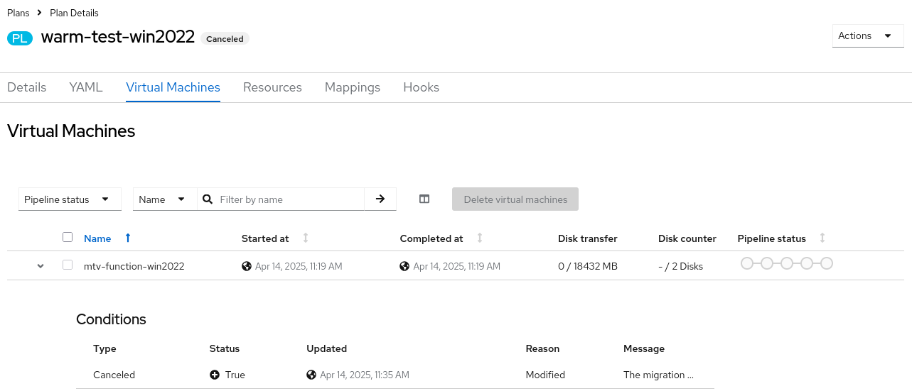 A canceled VM should be marked with the Canceled condition and no longer scheduled, and its resources should be cleaned up on a subsequent reconcile. Once the last VM is complete or canceled, the Plan status should reflect that and the controller should quiesce.