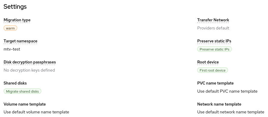 2) Start VM, it's running with rhel8.10 (/dev/sdb2), create warm migration plan to migrate it to ocp cluster with "Root Device: First root device" and "Preserve static IPs: on"