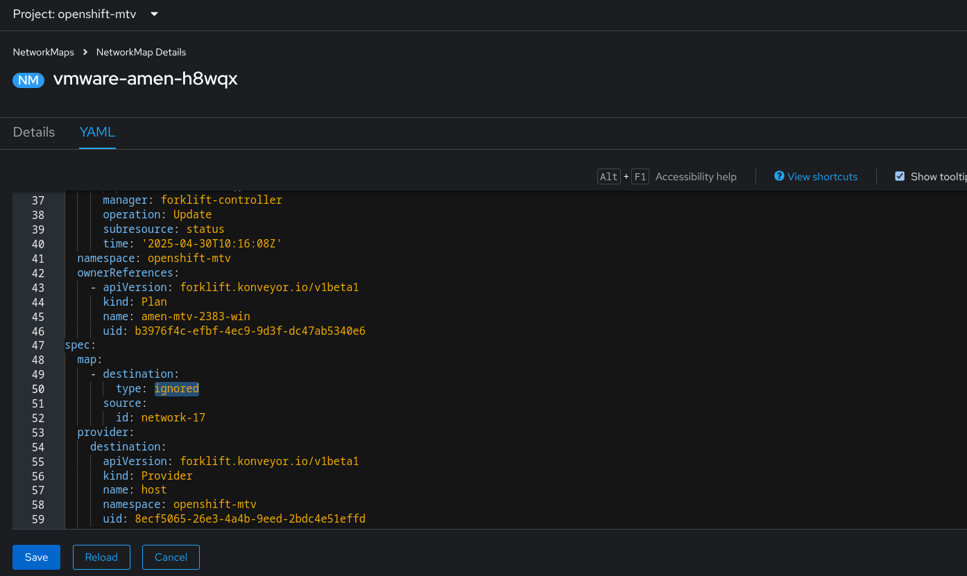 Controller supports Network Map destination type: ignored, user can set "destination type: ignored" in Network Map YAML file, the data is inconsistent between YAML file and UI, need to add the support on UI pages: a. Create migration plan -> Network mappings page b. Plan -> Plan Details -> Mappings: Network map page c. NetworkMaps -> NetworkMap Details -> Map page