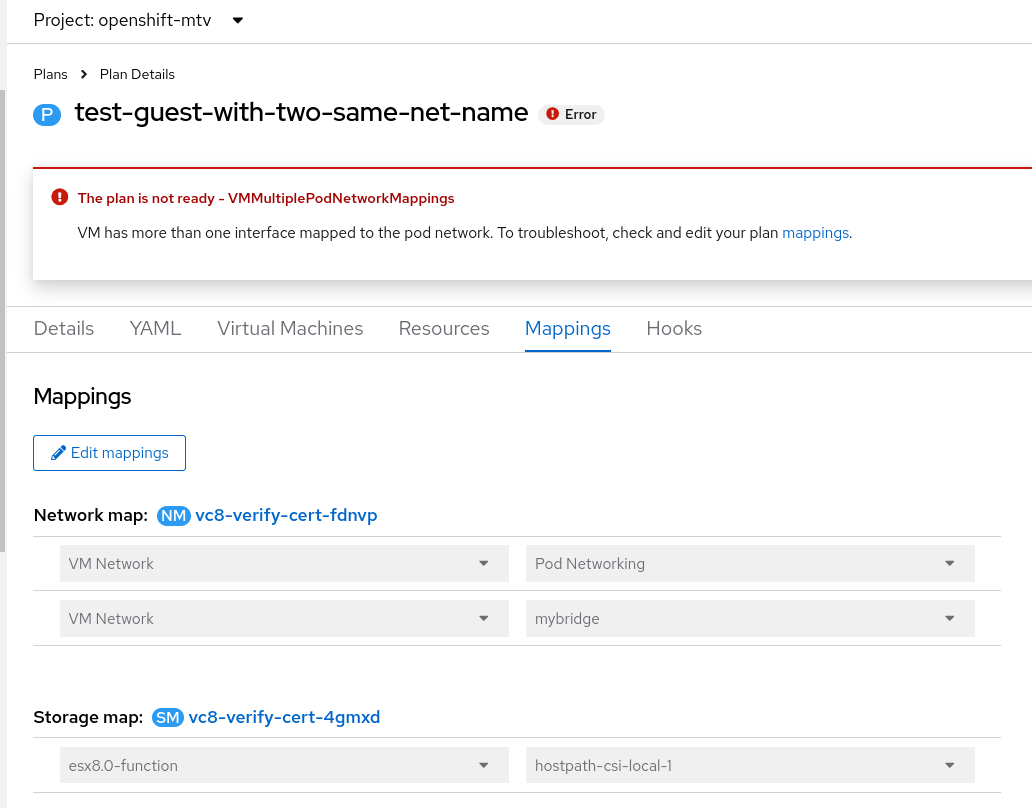 2. Migrate the guest from VMware on MTV but the migration plan is failed due to VM has more than one interface mapped to the pod network.