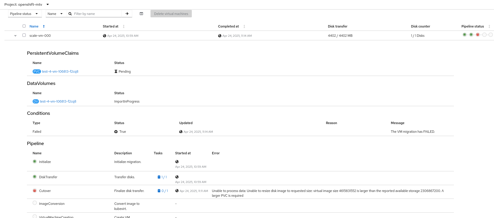 We have a OCP-V cluster with Fusion Access (GPFS) operator which use spectrumscale.csi.ibm.com Provisioner for Storage Class. VM Cold migration from vSphere works good. However VM Warm migration from vSphere failed on step "Cutover" with error "Unable to process data: Unable to resize disk image to requested size: virtual image size 4615831552 is larger than the reported available storage 2306867200. A larger PVC is required"