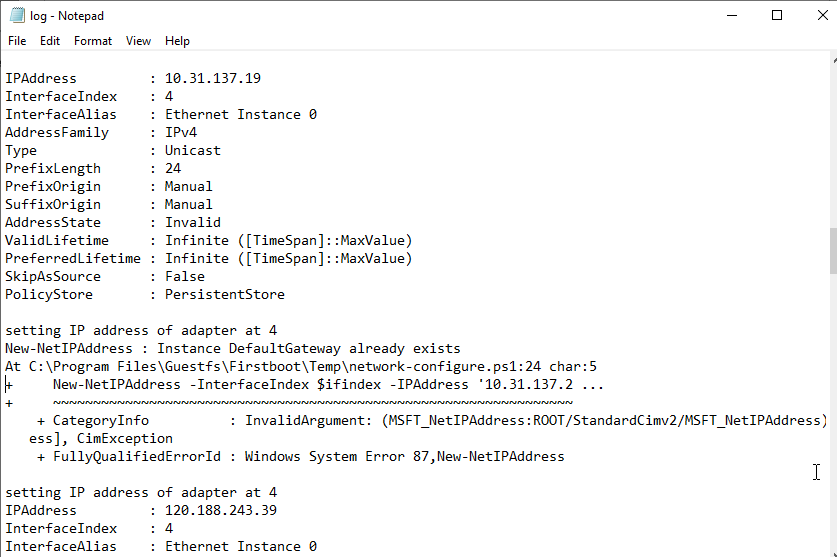 When the network-config.ps1 script is created it adds the gateway to entries from the same network.  This causes failures with only the first run working.