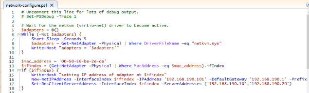 4) Check the network-configure script, it use the New-NetIPAddress command line to set ip address and default gateway
