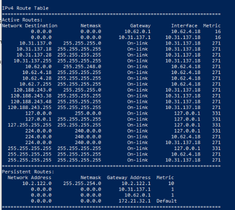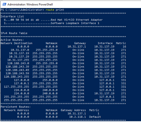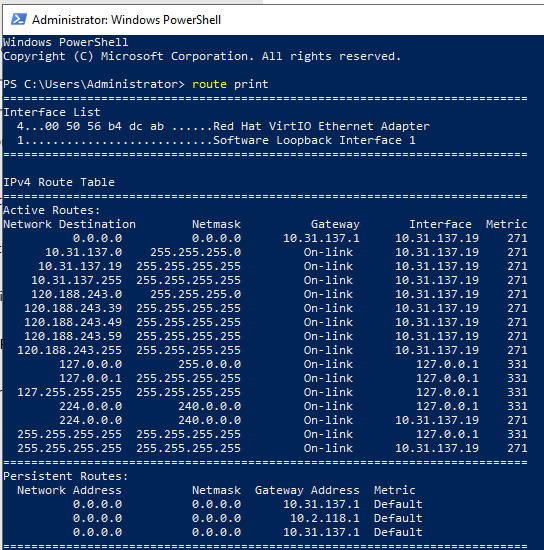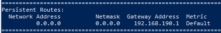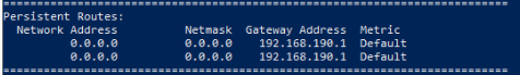 3) Login to VM on target cluster, check the route table, there is a new persistent route created as the default route. Two lines in the persistent routes for same network, we need to delete the old persistent route