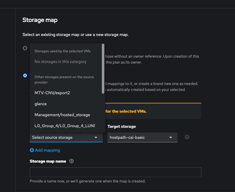 the "Storages used by the selected VMs" section of Source storage picklist will not contain values. All storage will show under "Other storages present on the source provider"