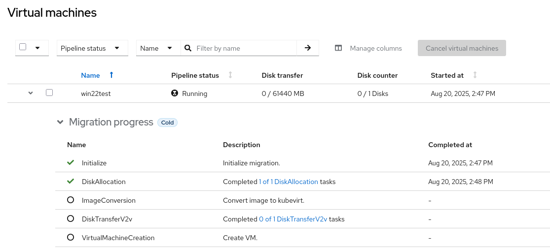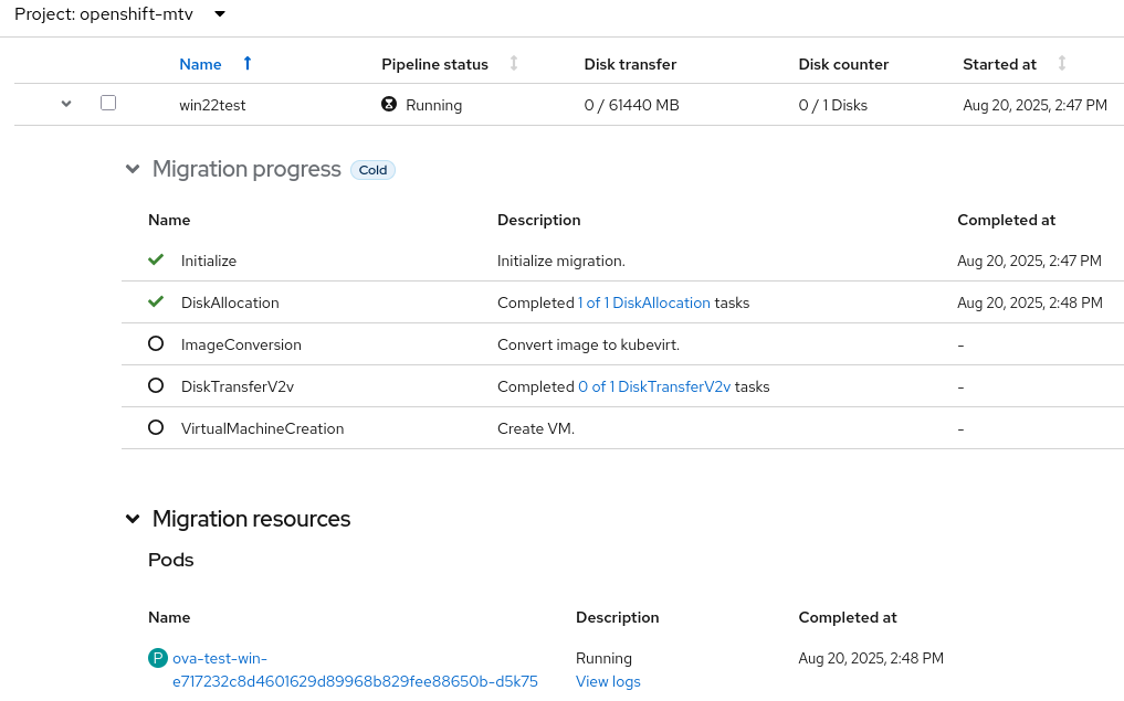 4)Migrate VM: win2022 from ova provider to target OCP cluster: udn-ns namespace, the migration plan hang