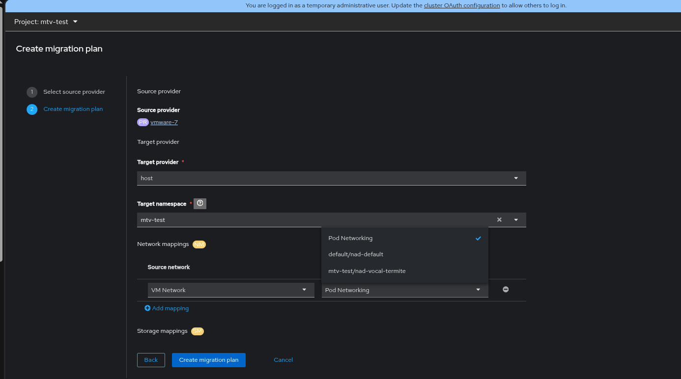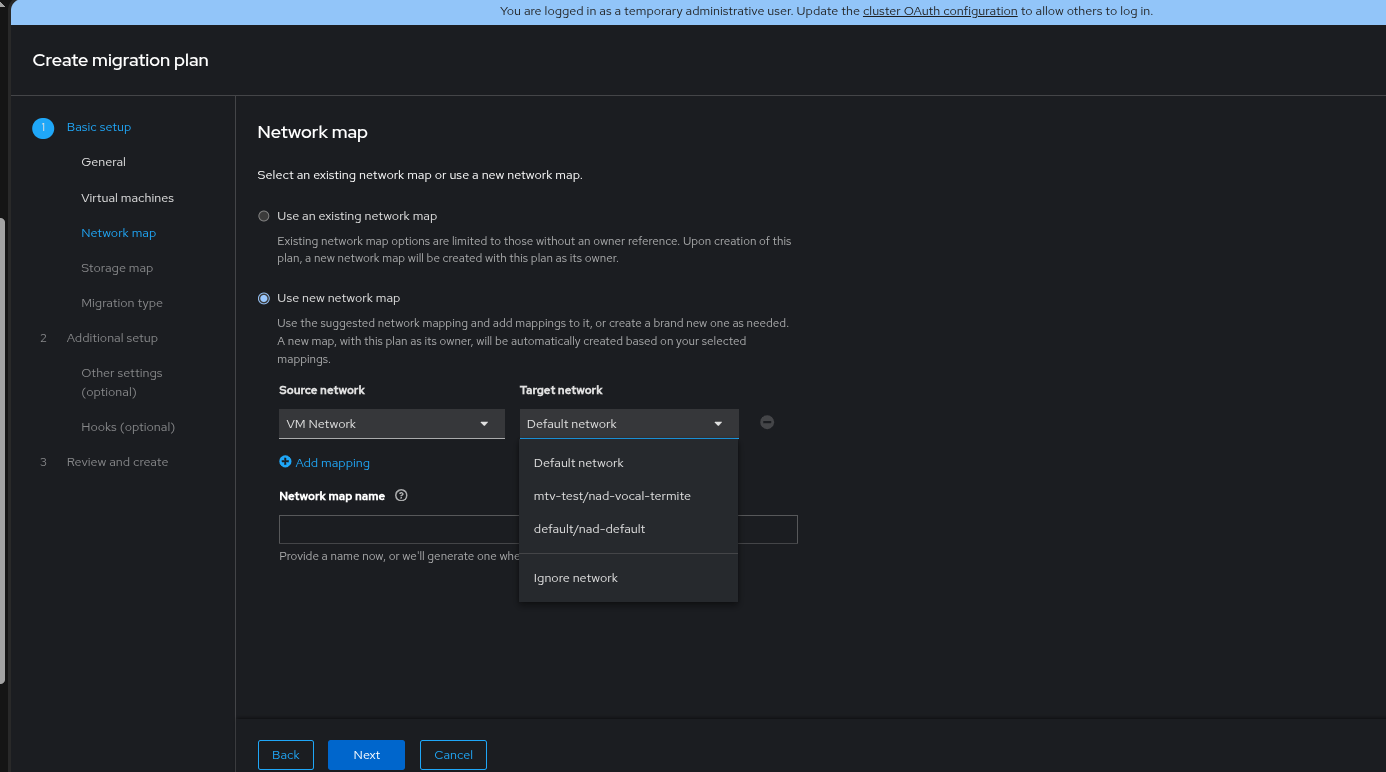 1.Ensure you have a fully updated cluster with a Network Attachment Definition (NAD) created in the default namespace and another NAD in a separate, user-defined namespace. 2. Install MTV version 2.9.3. 3. Create a new migration plan in the targeted namespace (not the openshift-mtv namespace). (Plan project and Target project should be same). 4. Navigate to the 'Network Map' section of the migration plan creation wizard. 5. Click the dropdown menu for 'Target Network'.