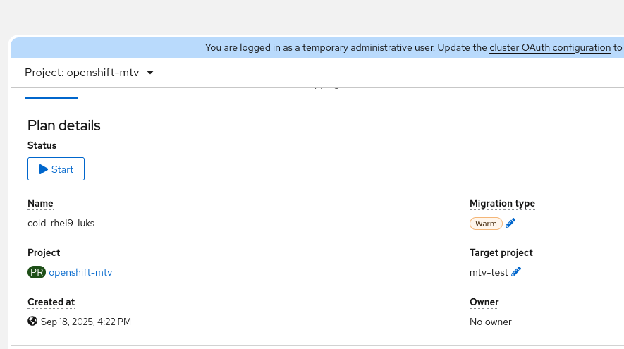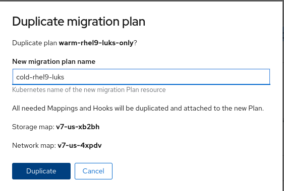1) Create a warm migrate plan: warm-rhel9-luks-only to migrate VM: mtv-func-rhel9-luks from VCenter7 to OCP cluster mtv-test project