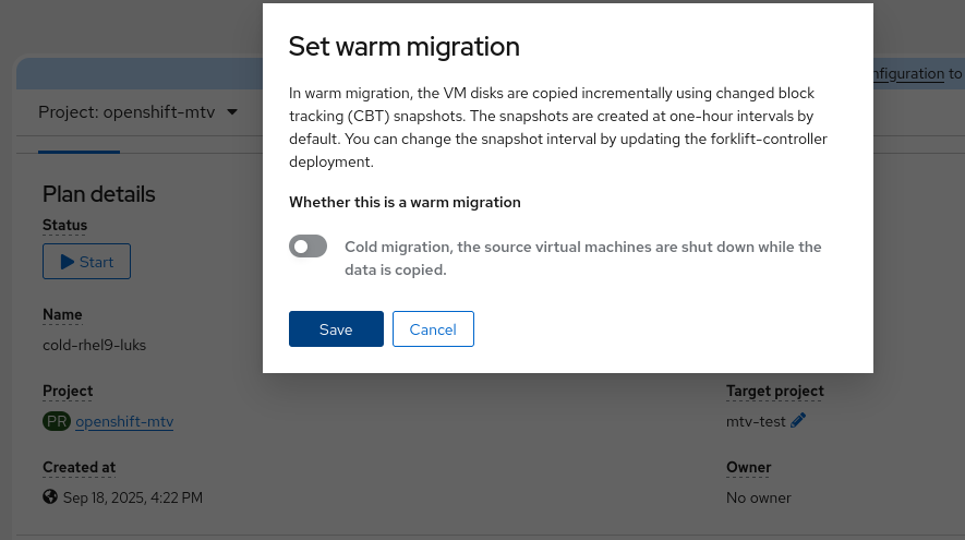 3) In the Plan details page, Edit the Migration type: warm to cold migration, click Save button