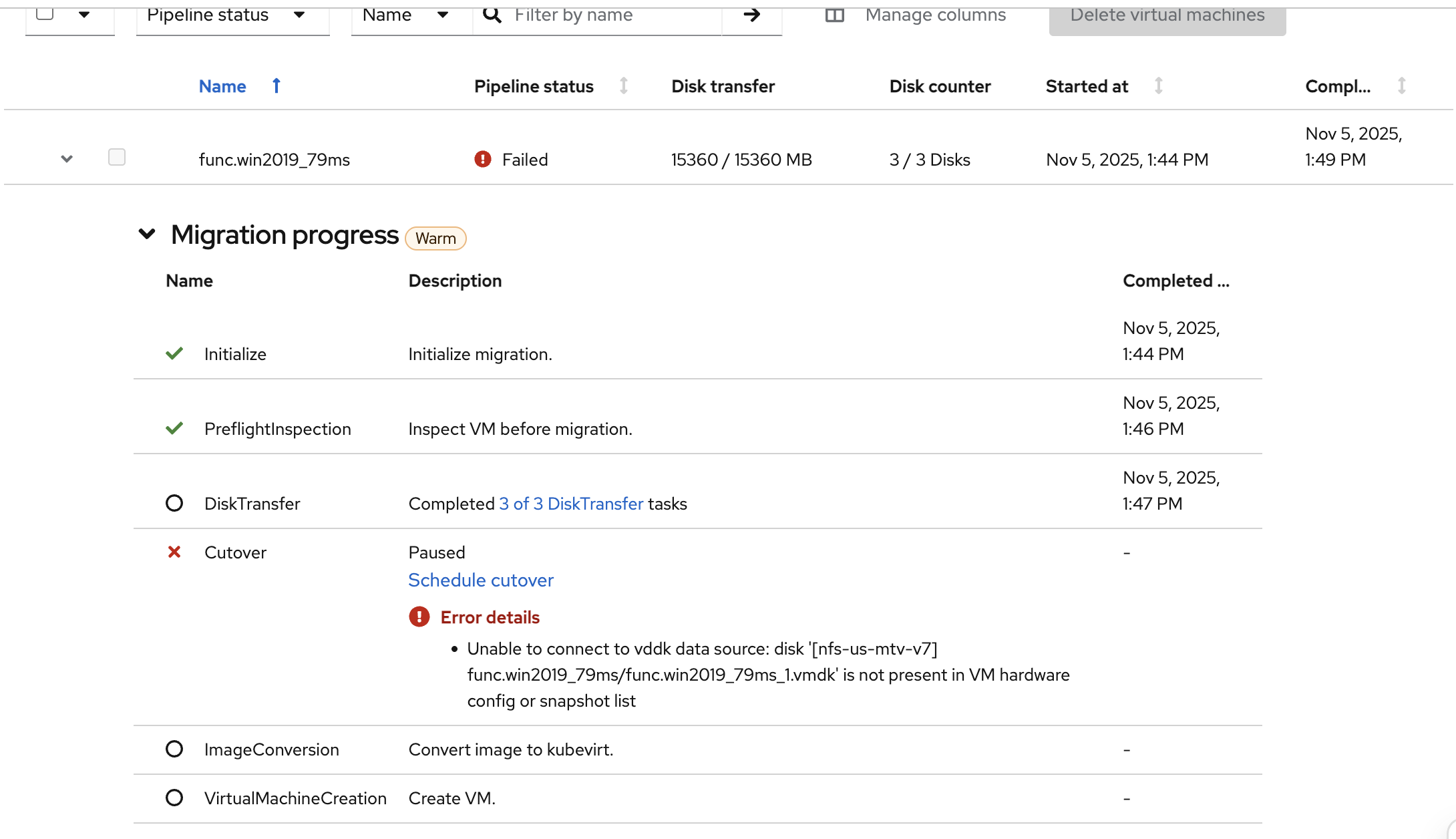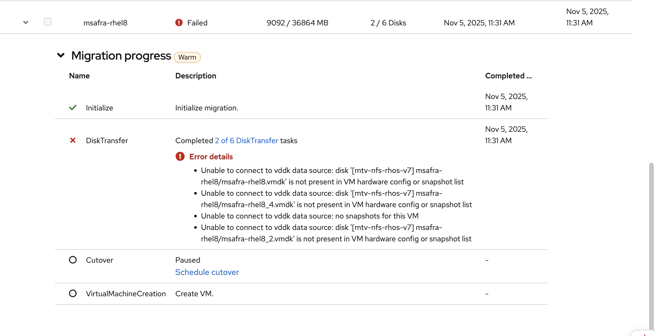 Warm migration fails on 'Disk transfer' phase with this message: Unable to connect to vddk data source: disk '[nfs-us-mtv-v7] mtv-func-rhel9-ameen/mtv-func-rhel9-ameen.vmdk' is not present in VM hardware config or snapshot list vCenter: 7.0.3 VM: ameen-RHEL9