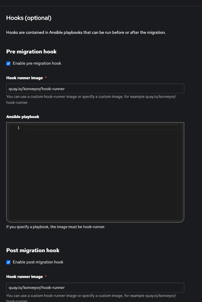 1. Go to Plans -> Create Plan 2. Navigate to the "Hooks" step 3. Enable "Pre migration hook" or "Post migration hook"