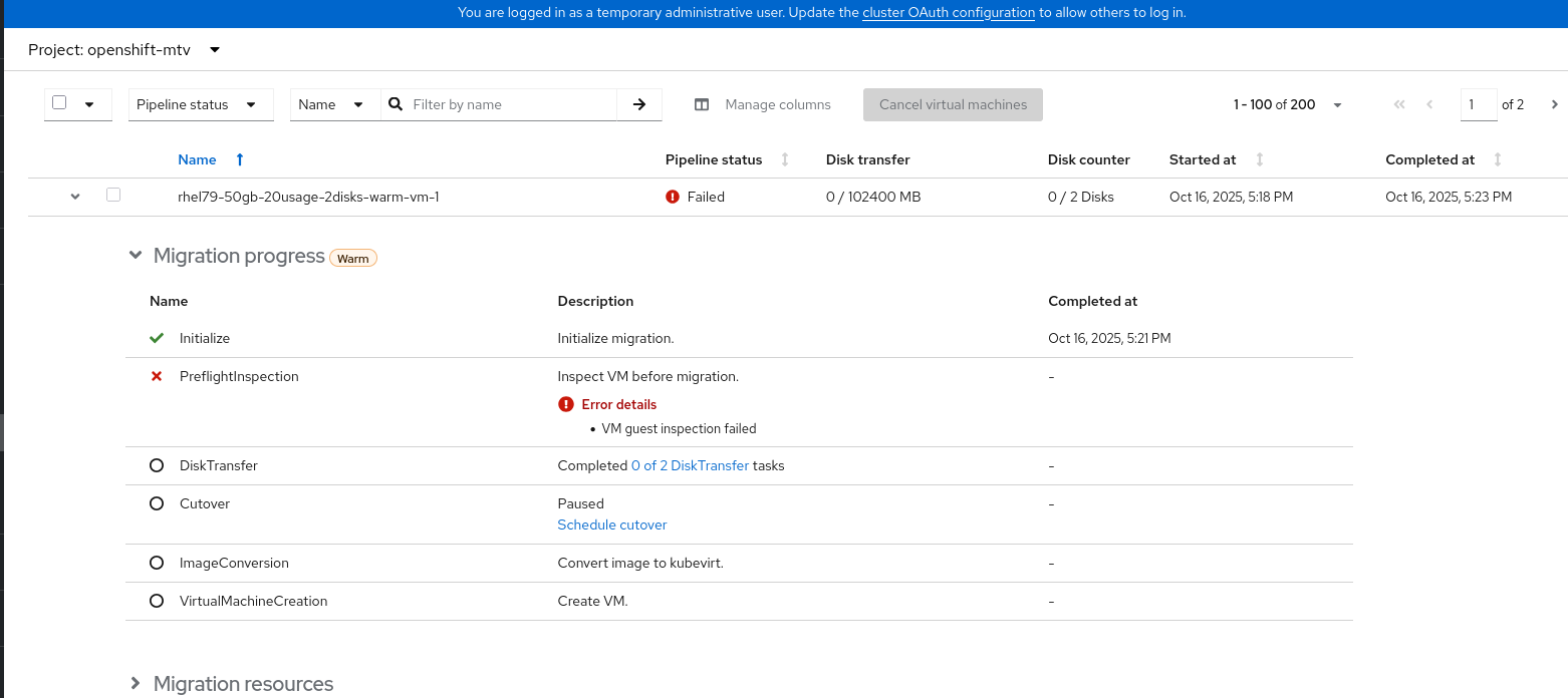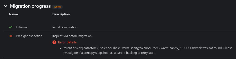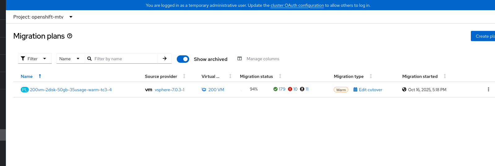 When running a large-scale warm migration (200 VMs, 2 disks each), 179 migrations complete successfully, but: