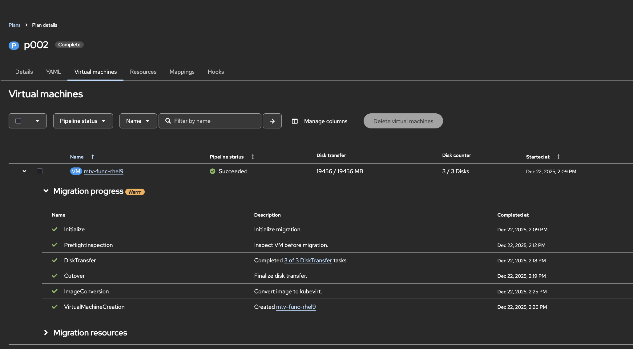 Before this update, the warm migration progress indicator for `DiskTransfer` remained unchecked due to incomplete progress evaluation. As a consequence, users saw incomplete migration progress for the `DiskTransfer` step. With this release, the `DiskTransfer` progress indicator shows a checkmark when all tasks are completed, improving migration visibility.