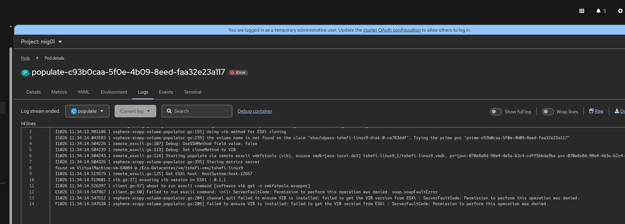 I1026 11:34:14.504226 1 remote_esxcli.go:107] Debug: UseSSHMethod field value: falseI1026 11:34:14.504239 1 remote_esxcli.go:113] Debug: Set cloneMethod to VIBI1026 11:34:14.504243 1 remote_esxcli.go:116] Starting populate via remote esxcli vmkfstools (vib), source vmdk=[eco-iscsi-ds3] tshefi-linux9_1/tshefi-linux9.vmdk, pv={pvc-070e8a8d-98e4-4e3a-b2c4-cdff5bbda9ba pvc-070e8a8d-98e4-4e3a-b2c4-cdff5bbda9ba map[backendUUID:4ba678e5-0d3a-4f05-bdda-e516e3f2e157 internalName:trident_pvc_070e8a8d_98e4_4e3a_b2c4_cdff5bbda9ba name:pvc-070e8a8d-98e4-4e3a-b2c4-cdff5bbda9ba protocol:block storage.kubernetes.io/csiProvisionerIdentity:1760616938134-3672-csi.trident.netapp.io]}I1026 11:34:14.504326 1 vsphere-xcopy-volume-populator.go:355] Staring metrics serverfound vm VirtualMachine:vm-64084 @ /Eco-Datacenter/vm/tshefi-vms/tshefi-linux9I1026 11:34:14.519579 1 remote_esxcli.go:125] Got ESXi host: HostSystem:host-12657I1026 11:34:14.519601 1 vib.go:27] ensuring vib version on ESXi : 0.1.1I1026 11:34:14.526397 1 client.go:57] about to run esxcli command [software vib get -n vmkfstools-wrapper]E1026 11:34:14.547467 1 client.go:60] Failed to run esxcli command: <nil> ServerFaultCode: Permission to perform this operation was denied. soap.soapFaultErrorI1026 11:34:14.547512 1 vsphere-xcopy-volume-populator.go:204] channel quit failed to ensure VIB is installed: failed to get the VIB version from ESXi : ServerFaultCode: Permission to perform this operation was denied.F1026 11:34:14.547520 1 vsphere-xcopy-volume-populator.go:206] failed to ensure VIB is installed: failed to get the VIB version from ESXi : ServerFaultCode: Permission to perform this operation was denied.