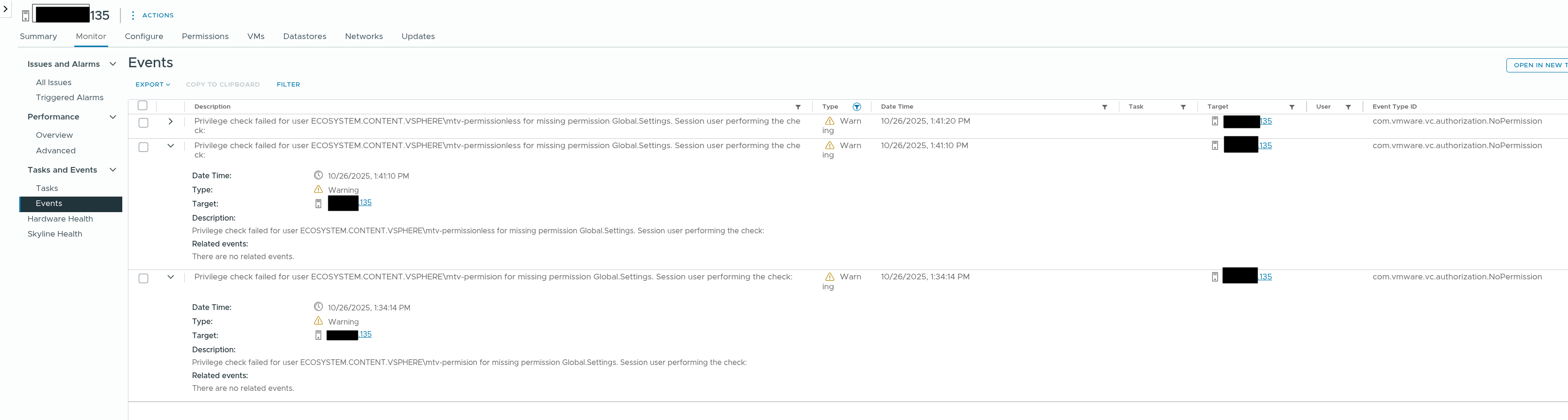 Following MTV minimum permissions role, created a user with that role assigned at eco-vcenter's root level with trickle down, created a storage provider and map, try to migrate a VM. Populator pod fails: 11:34:14.547467 1 client.go:60] Failed to run esxcli command: <nil> ServerFaultCode: Permission to perform this operation was denied. soap.soapFaultErrorI1026 11:34:14.547512 1 vsphere-xcopy-volume-.. Same error was reproduced with a second role/user which does indeed lack datastore access rights, it too hit this same error