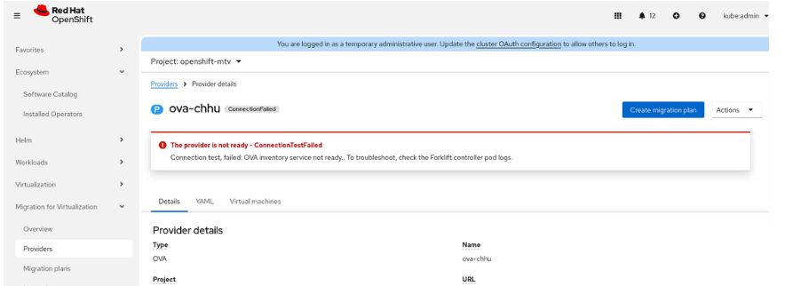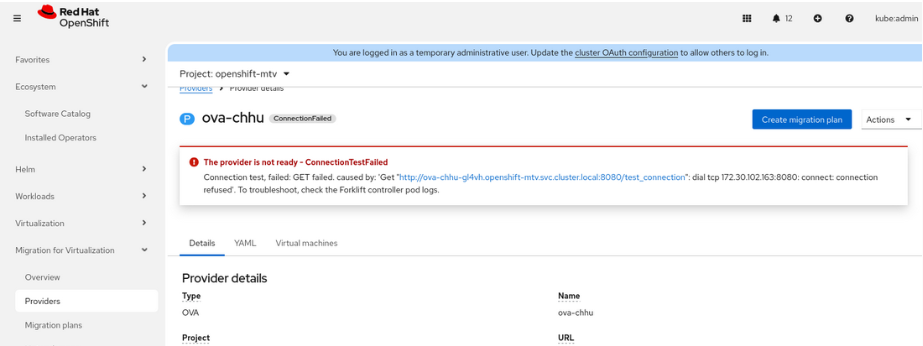 1) Create a ova provider as below, hit the ConnectionTestFailed message: