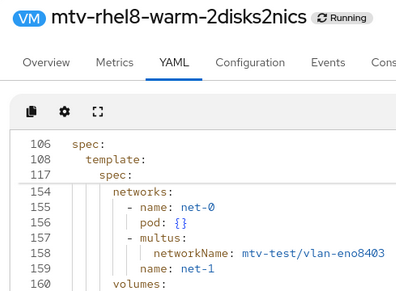 Migrate another VM mtv-rhel8-warm-2disks2nics from the same provider: ova-chhu, after migration, check on the target cluster: the VM yaml file with 2 interface settings and VM has 2 interface with correct ip address, more details as below