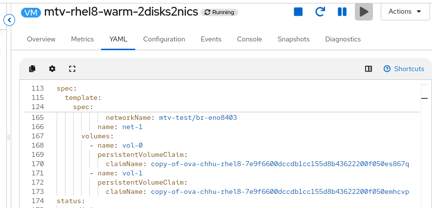 oc get pvc|grep rhel8 copy-of-ova-chhu-rhel8-7e9f6600dccdb1cc155d8b43622200f050emhcvp Bound pvc-98c4ccaf-bc97-4ce7-b57c-d3410ff9128f 16Gi RWX ocs-storagecluster-ceph-rbd <unset> 11h copy-of-ova-chhu-rhel8-7e9f6600dccdb1cc155d8b43622200f050es867q Bound pvc-dfa1f805-7764-4d0d-97a1-d409424746bc 12Gi RWX ocs-storagecluster-ceph-rbd <unset> 11h ova-store-pvc-ova-chhu-copy-of-ova-chhu-rhel8-d2l4z Bound ova-store-pv-ova-chhu-copy-of-ova-chhu-rhel8-zfzfm 1Gi ROX <unset> 11h ova-store-pvc-ova-chhu-copy-of-ova-chhu-rhel8-m8cdg Bound ova-store-pv-ova-chhu-copy-of-ova-chhu-rhel8-2gt7r 1Gi ROX <unset> 11h ova-store-pvc-ova-chhu-copy-of-ova-chhu-rhel8-p5ldc Bound ova-store-pv-ova-chhu-copy-of-ova-chhu-rhel8-ccmd2 1Gi ROX <unset> 11h ova-store-pvc-ova-chhu-copy-of-ova-chhu-rhel8-qqpcw Bound ova-store-pv-ova-chhu-copy-of-ova-chhu-rhel8-htlmx 1Gi ROX <unset> 11h ova-store-pvc-ova-chhu-copy-of-ova-chhu-rhel8-zjvxx Bound ova-store-pv-ova-chhu-copy-of-ova-chhu-rhel8-829sf 1Gi ROX <unset> 11h