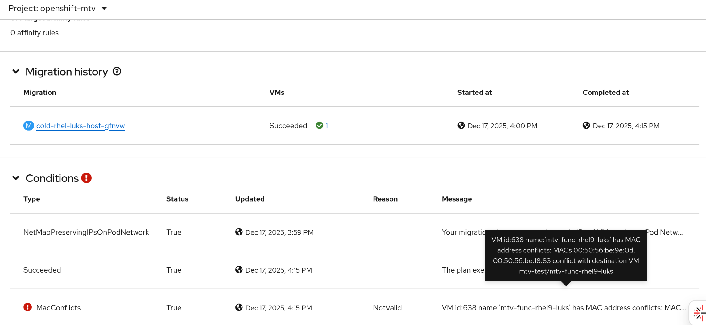 "VM id:638 name:'mtv-func-rhel9-luks' has MAC address conflicts: MACs 00:50:56:be:9e:0d, 00:50:56:be:18:83 conflict with destination VM mtv-test/mtv-func-rhel9-luks"