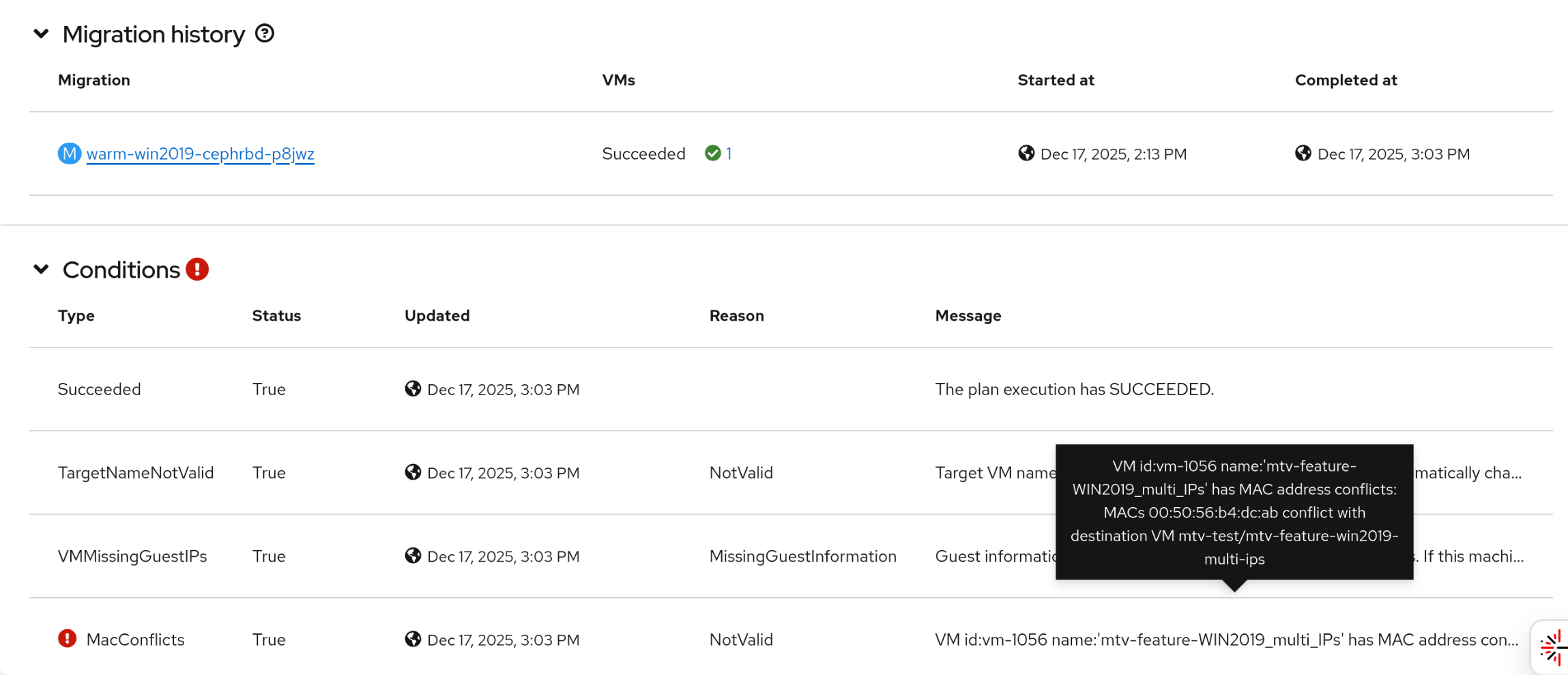 Create a cold migration plan to migrate VM from ESXi host to OCP cluster, the plan executed successfully, after the migration there is a new message about MAC address conflicts, which confuse user.