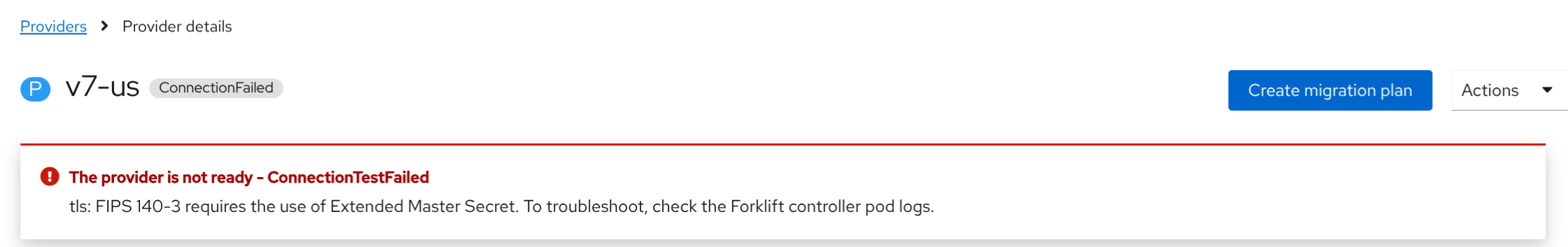 The provider is not ready - ConnectionTestFailedtls: FIPS 140-3 requires the use of Extended Master Secret. To troubleshoot, check the Forklift controller pod logs.
