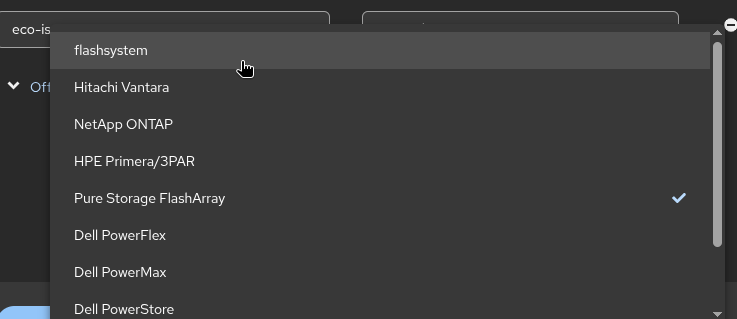 On MTV 2.11.0 When you edit a storagemap under offload options/Storage product we get a list of supported vendors, I just noticed the first one on the list is "flashsystem" which looks odd/out of place as at the end of the list we also have "IBM FlashSystem" I assume they are they same and we just need to remove the first one,