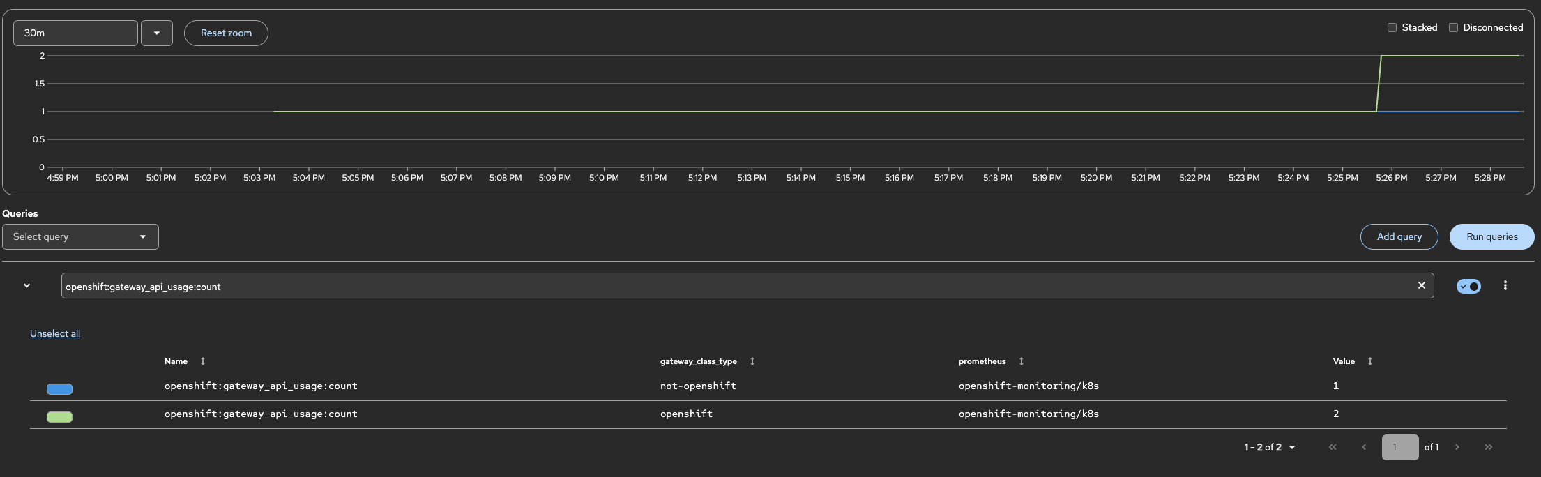 Telemetry to tell us who is using the feature - openshift gatewayclass in use, other gatewayclasses in use. Use EBS number. See NE-682 for details on what was done in the past. Existing HAProxy metrics already tell us how many routes people are using, so no new metrics needed for determining whether HAProxy is still in use.
