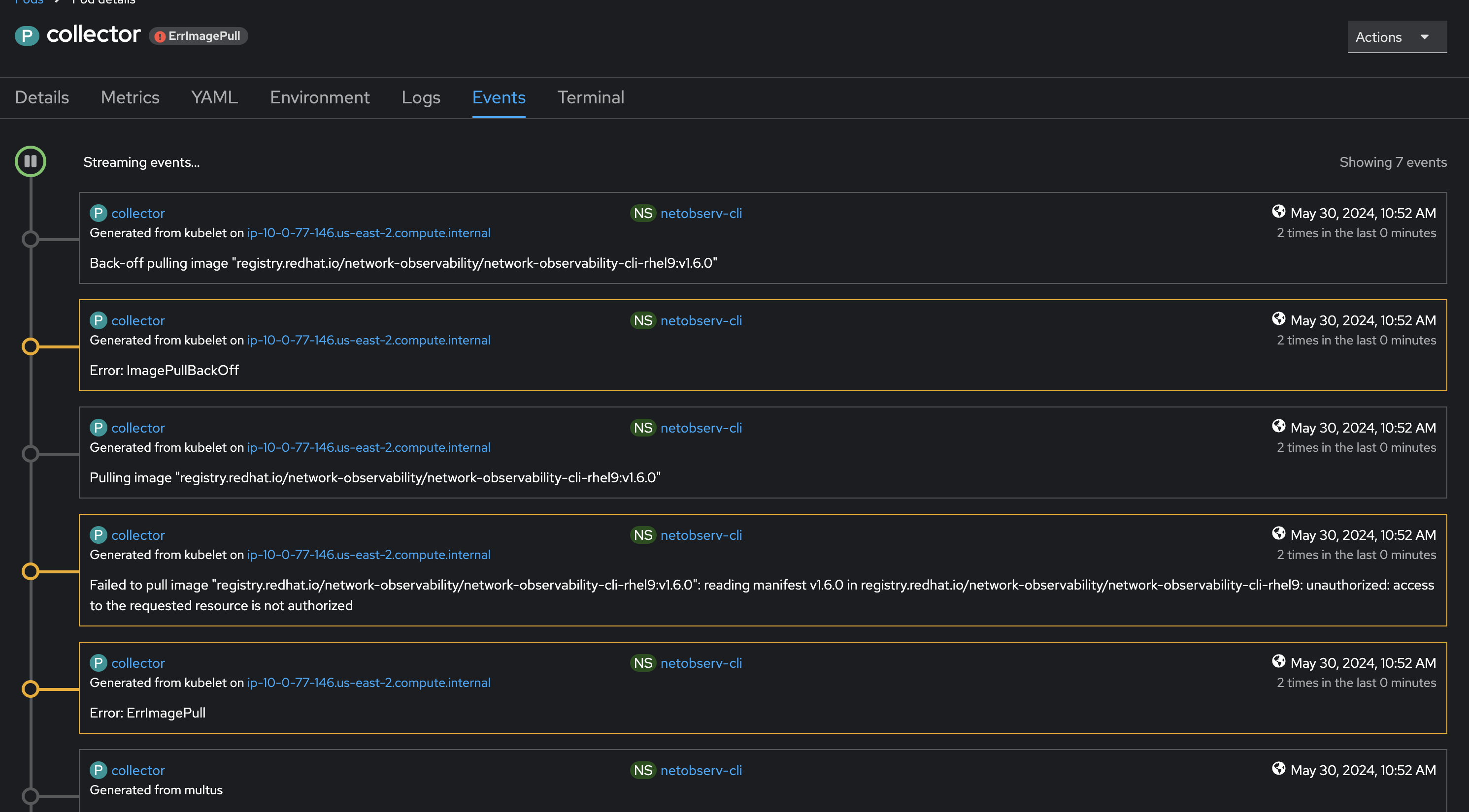 Collector pod does not come up and cli is cleaned up after waiting for sometime. PFA the screenshot for the events of collector pod